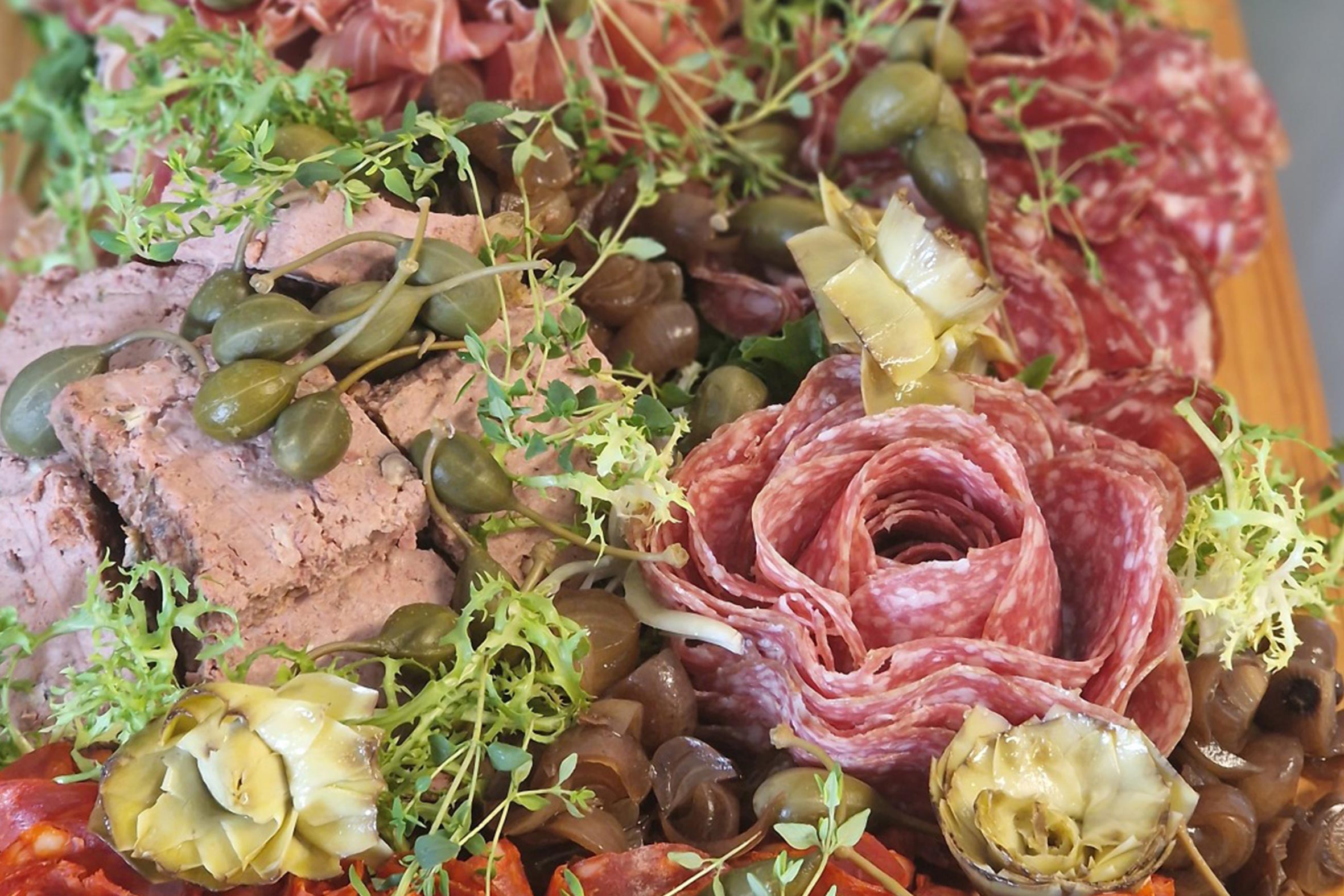 Eksklusiv charcuteriplanke med en perlerække af Steensgaards produkter inklusiv tilbehør.